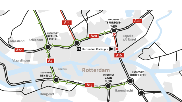 De A16 richting Dordrecht is afgesloten van vrijdagavond 26 april 22.00 uur tot maandagochtend 29 april 05.00 uur. De weg is dicht tussen het knooppunt Terbregseplein en afrit 26 Rotterdam Kralingen. In tegengestelde richting blijft de A16 open voor verkeer. Let op: het zal extra druk zijn vanwege het Koningsdagweekend maar ook omdat dan de snelweg A13 richting Rotterdam dicht is tussen Delft-zuid (afrit 10) en knooppunt Kleinpolderplein (Rotterdam). Plan uw route dus van tevoren en maak gebruik van alternatieven. Door de omleidingen moeten weggebruikers rekening houden met tien tot dertig minuten extra reistijd.