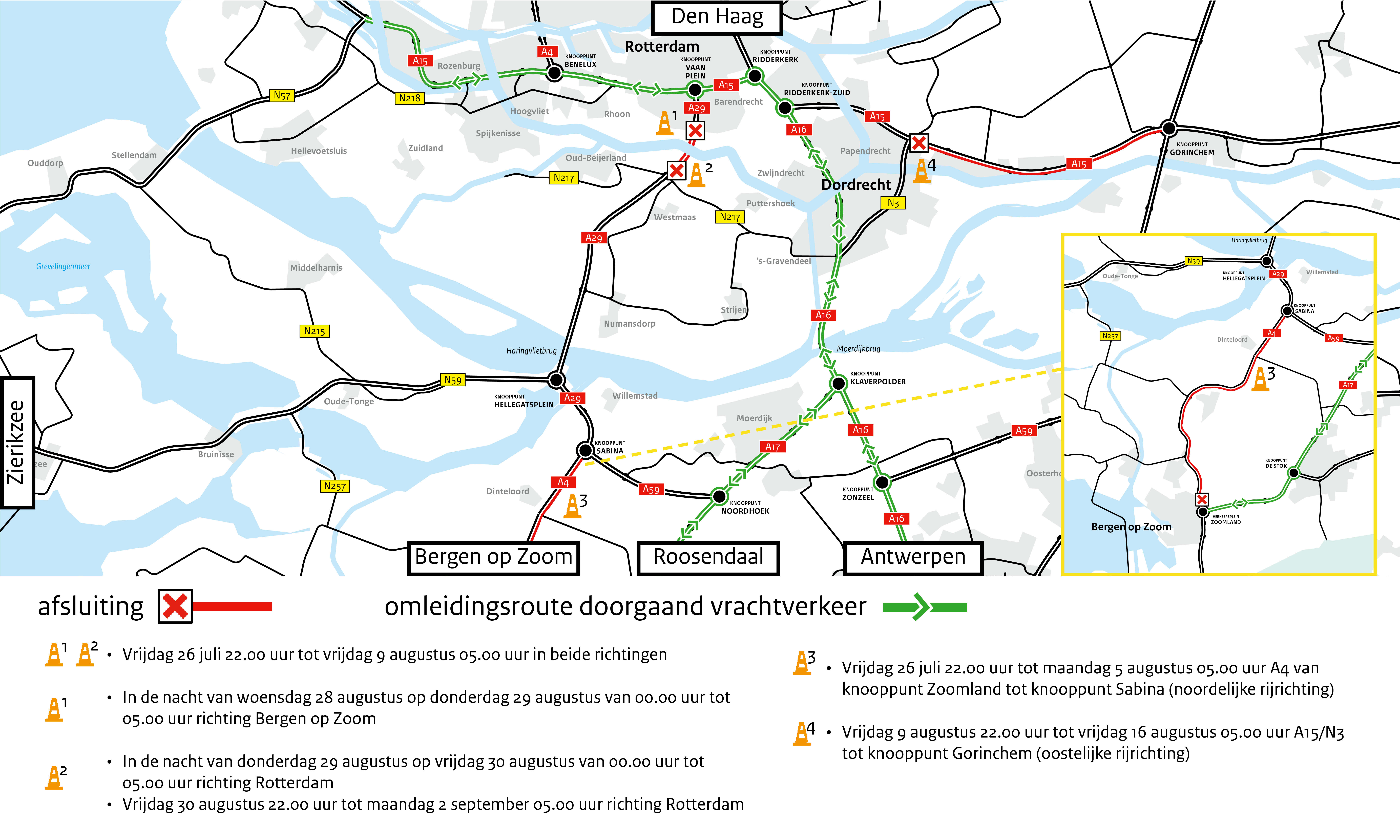 Bereid je bedrijfsvoering en planning goed op deze afsluiting en omleidingsroutes voor om onnodige extra hinder te voorkomen. Doorgaand (vracht)verkeer wordt dringend verzocht de omleidingsroute via de A15, A16 en A17, en andersom, te volgen. Hieronder een overzicht met de omleidingsroute voor doorgaand vrachtverkeer.