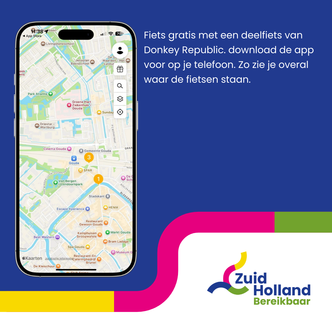 Deelfietsen zijn ideaal voor het laatste stuk van je reis. In Zuid-Holland zijn op veel plekken de oranje Donkey Republic deelfietsen beschikbaar. Met deze actie kun je daar drie maanden gratis gebruik van maken. Reis je voor je werk of opleiding met de trein? Dan vind je in Midden-Holland vaak op loopafstand van een station een beschikbare oranje deelfiets. Ideaal voor je laatste kilometer(s).