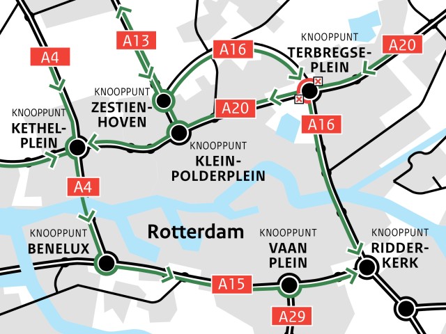- Verkeer richting Dordrecht via A20, A4 (Beneluxtunnel) en A15