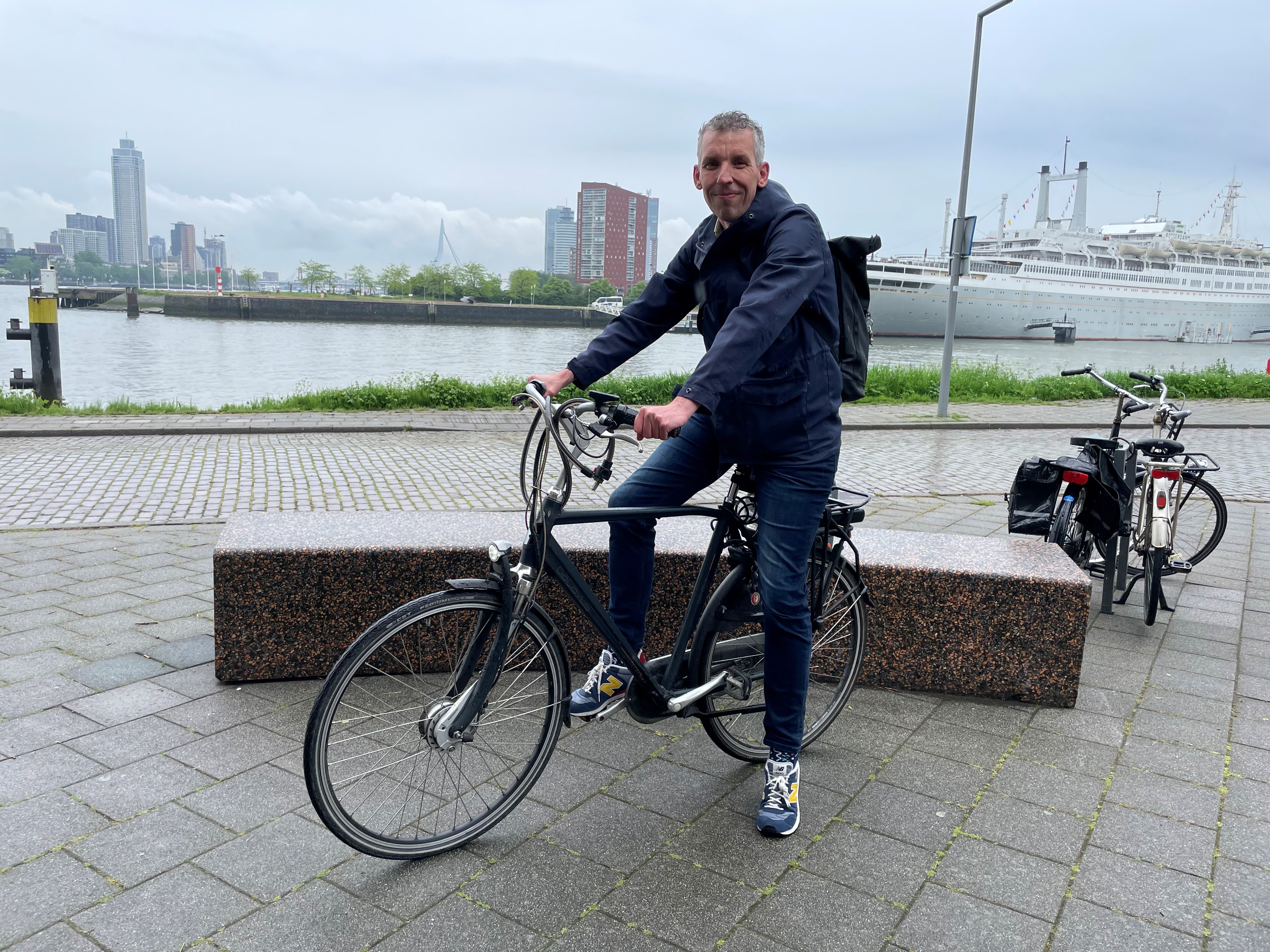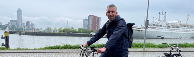 Jeroen fietst elke dag op een Batavus e-bike van zijn huis in Poortugaal naar de Westblaak in hartje Rotterdam. Een afstand van 11,5 kilometer. ”Een mooie route door de Waalhaven met zijn bedrijvigheid en door de Maastunnel. Met die prachtige roltrappen omhoog en omlaag. Echt een feestje! Die afstand is goed te doen,” zegt hij. “Als ik de metro neem dan doe ik er 25 minuten over, en met de fiets 35 minuten. Dus dat maakt niet veel uit. De auto is wel een optie maar een slechte. Ik denk dat ik onderweg bijna 20 verkeerslichten tegenkom. Laat mij maar lekker fietsen. Die e-bike heb ik een paar jaar geleden overgenomen van mijn zwager. Nadeel is dat de batterij waarschijnlijk wat is verouderd. Ik moet hem nu constant opladen.”
