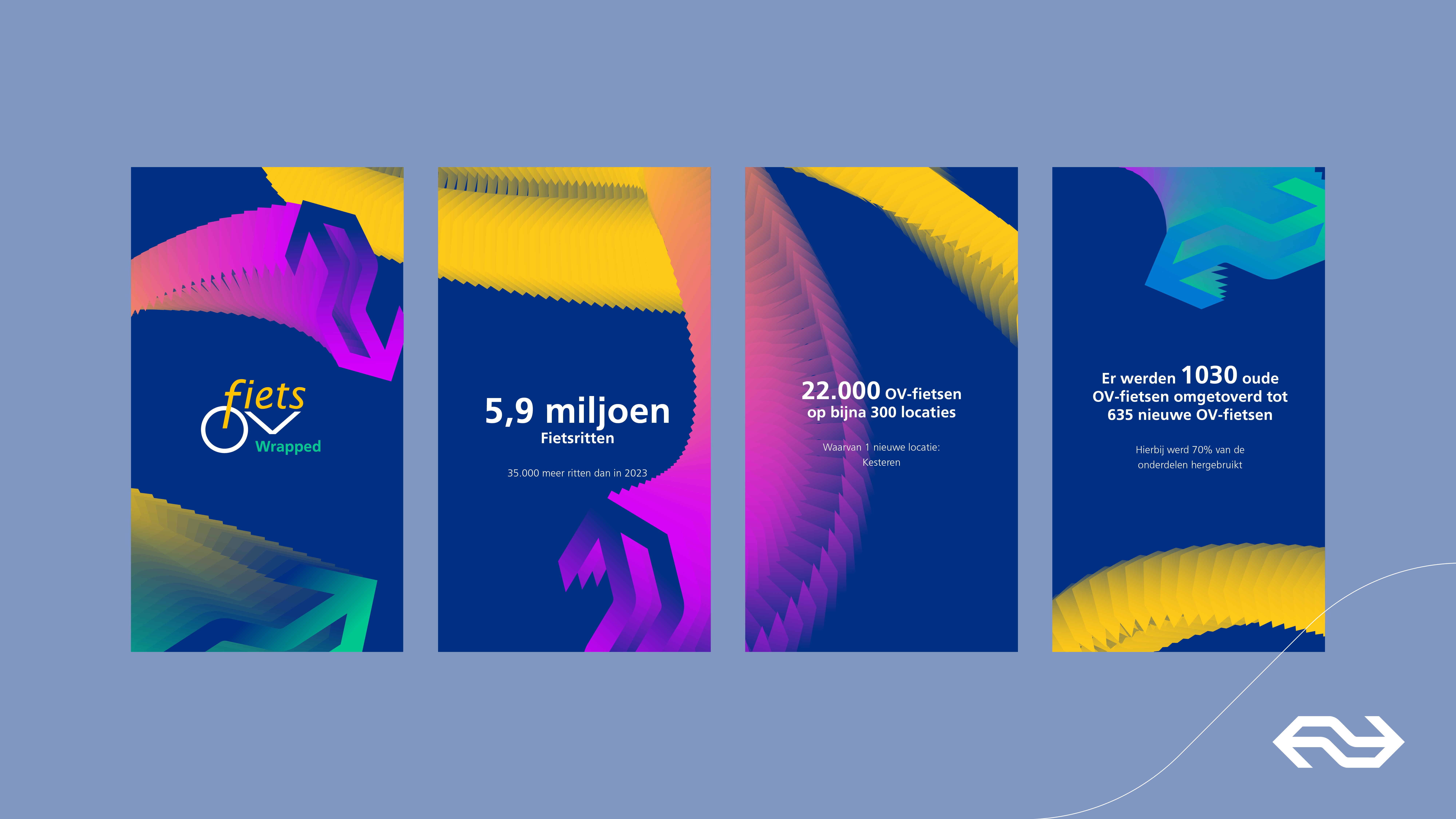 2024 was een echt fietsjaar. Opnieuw zijn er een recordaantal ritten gemaakt met de OV-fiets. Meer dan 5,9 miljoen; 35.000 meer ritten dan in 2023. Daarnaast vierden de NS dat de OV-fiets al 15 jaar bij het bedrijf hoort. Kunstenaar Daniël Roozendaal ontwierp voor elke provincie een unieke fiets. Per provincie zijn vijf OV-fietsen versierd met deze print.