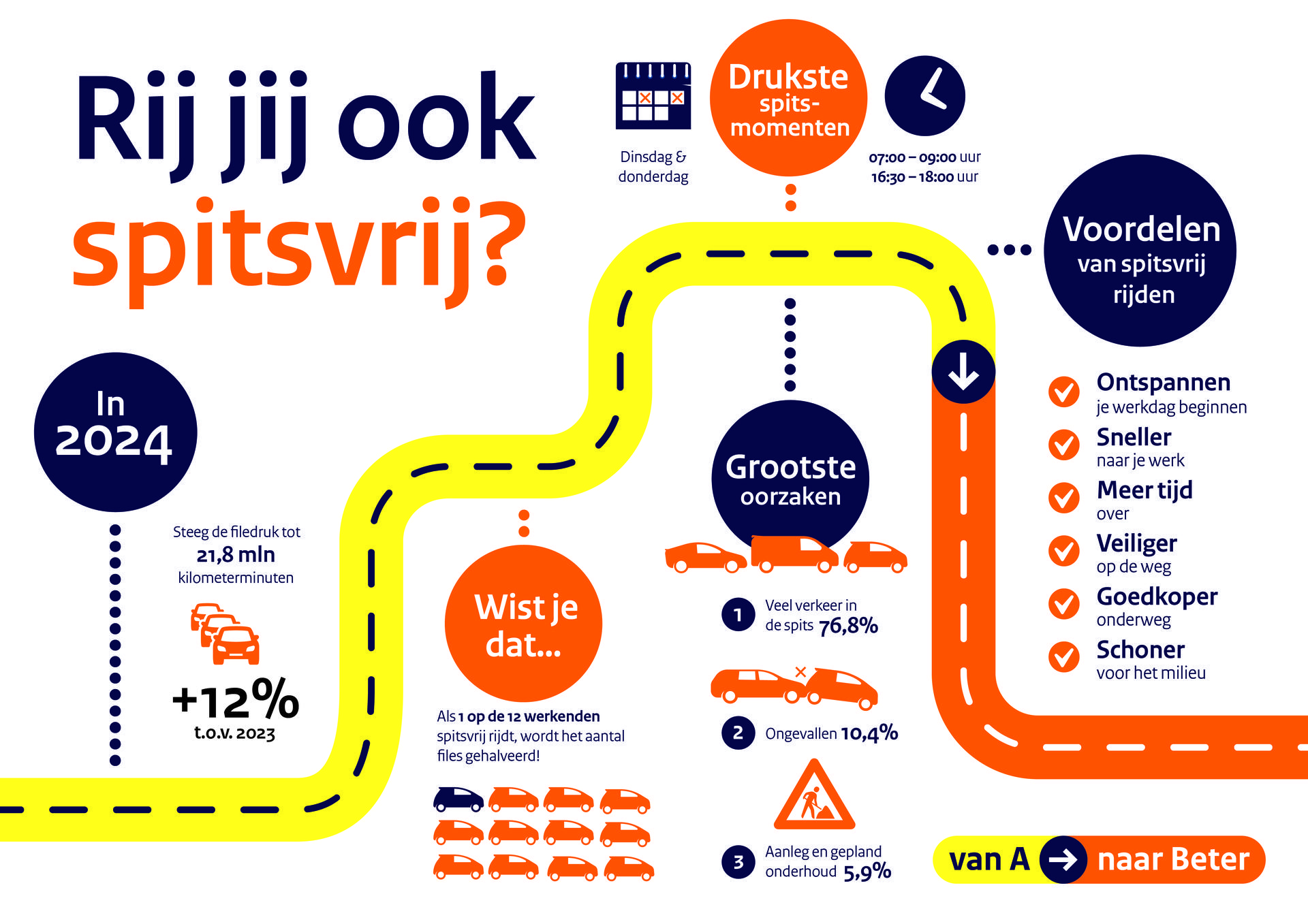 Spitsvrij rijden betekent reizen buiten de piekuren van 7:00 en 9:00 en 16:30 en 18:00 uur. Bijvoorbeeld door op dinsdag of donderdag thuis te starten en later naar het werk te gaan.