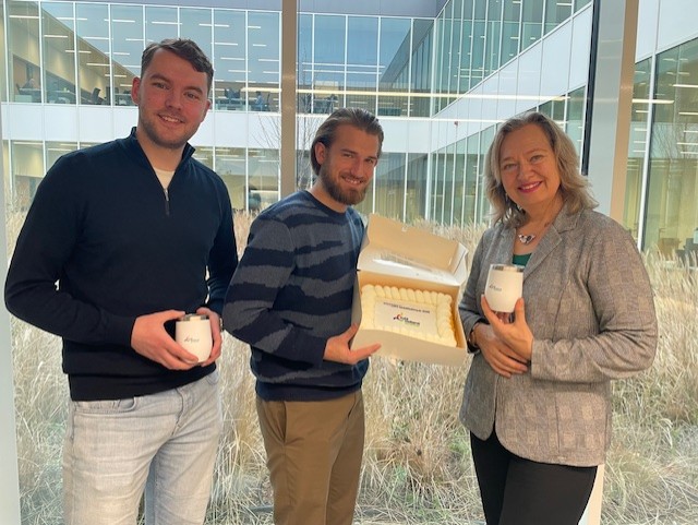 Bij de ondernemersbijeenkomst Rotterdam in november werd de mobiliteitskennis van de deelnemers getest met een quiz. Simon Melief (applicatiebeheerder) en Sten Fiere (marketeer) van Neele-Vat deden mee en wonnen beide. Karin van Reeuwijk, portefeuillehouder gebied Rotterdam van Zuid-Holland Bereikbaar, overhandigde de taart en de ZHB bekers aan de winnaars.